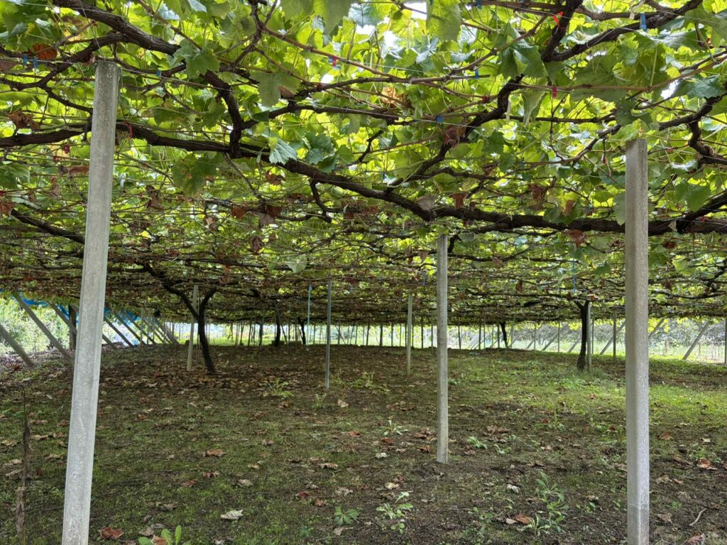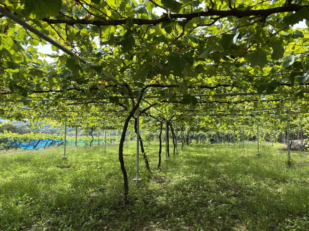 棚の上を枝が自由に延びていくのに任せる剪定方法で、房のなるところを追いかけるように人が作業をします。昔ながらの剪定方法で作業効率は悪いですが、反収は2tほどで多い方です。