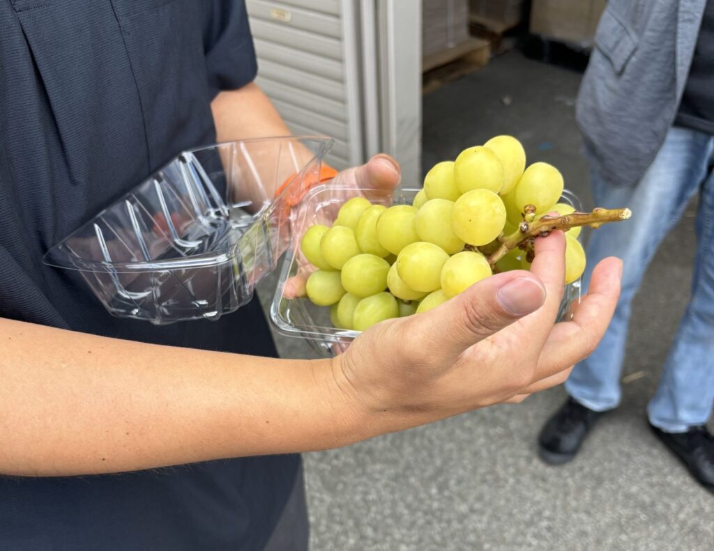 まず、初めにお邪魔したのは元薬局の店舗を改修して作られた選果場。お邪魔した9月末はシャインマスカットの最盛期ということもあり、大勢のスタッフが等級や規格ごとに収穫物を梱包する作業にあたっていました。6月中旬〜お盆ごろまでは桃を、お盆〜10月中旬ごろまではぶどうをこの選果場に集約して選別・梱包・出荷作業をされるそうです。各契約農家からの納品は運送会社と連携し、電話一本で地域を回るトラックが収穫物を取りに行き、輸出されるものについても同じ運送会社が空港までパレットを届けます。